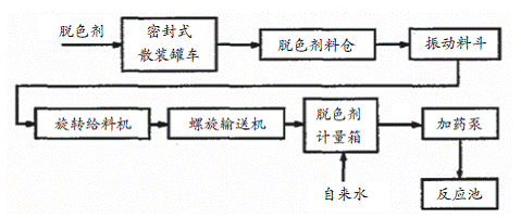 粉狀脫色劑粒徑75μm,密度0.46-0.5mg/m3,由密封罐車運輸,卸灰。氣體由罐頂氣粉分離后排至大氣。出料口處設防堵設施,脫色劑進入旋轉給料機,旋轉給料機電機采用變頻控制,脫色劑投加量與反應池入口流量成比例調節(jié)。計量后的脫色劑落入輸送機,輸送機將脫色劑輸送至溶解箱的上部,在溶解箱內粉與從另側進入的清水混合、攪拌,溶解成脫色劑,由加藥泵送往反應池。
