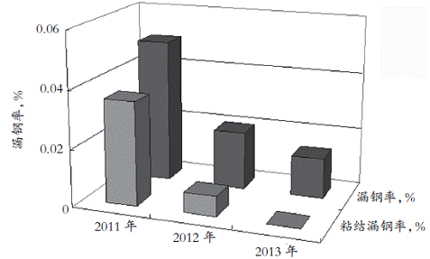 2013年下半年后已經(jīng)實現(xiàn)300萬t無漏鋼,17個月以上未發(fā)生粘結(jié)漏鋼。2011年后漏鋼發(fā)生率變化如圖1所示。