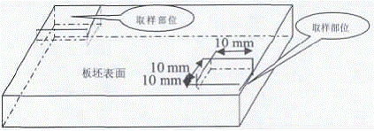 2012年5月以來,鄂鋼軋制的45鋼板出現沿軋制方向兩側的“帶狀”裂紋。為分析邊裂缺陷原因,選取5個爐號的缺陷鋼板,每塊鋼板取2個試樣,尺寸為10mm×10mm×10mm(圖1)。