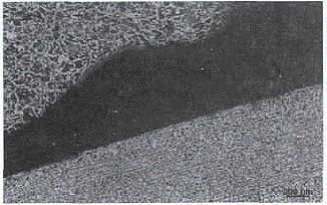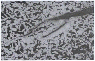 試樣全部采用3%硝酸酒精溶液侵蝕后,用高倍顯微鏡進行觀察,裂紋顯微形貌如圖2、圖3所示。裂紋深約0.56mm,其內有大量氧化物和氧化圓點,裂紋附近有明顯脫碳現象,且存在晶粒長大,邊緣脫碳在0.50mm左右,基體組織為鐵素體+珠光體。再將鋼板缺陷處沿軋制方向剖開,發(fā)現內部有明顯未焊合裂紋,裂口有明顯的氧化層,氧化圓點呈彌散分布,周邊基體被破壞。由此可推斷,45鋼板材的原板坯邊部應存在氣泡或裂紋缺陷,因為板坯中的氣泡在加熱和軋制過程中無法愈合,可形成板材邊部裂紋。