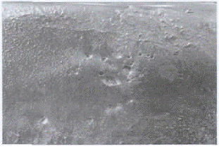 對原板坯沿拉坯方向窄面取樣1塊,尺寸為100mm×300mm×300mm,再將試樣沿側面進行剝皮,并對板坯角部進行火焰清理,清理后特征如圖4所示?梢钥吹,板坯皮下3~9mm區(qū)域內存在針孔,且板坯角部肉眼可見團族狀氣孔。