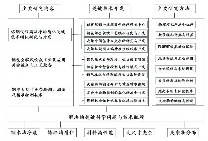 針對(duì)現(xiàn)有精品鋼潔凈化冶煉的突出問(wèn)題和行業(yè)難題,課題組經(jīng)系統(tǒng)調(diào)研,確定了項(xiàng)目的主要研究?jī)?nèi)容、關(guān)鍵技術(shù)開發(fā)和主要研究方法,確立了項(xiàng)目總體思路。見圖1.