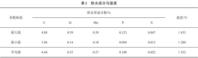 目前,我國鐵礦資源日益貧乏,進(jìn)口礦石成本不斷增加,大部分鋼鐵企業(yè)的鐵水供應(yīng)一直是生產(chǎn)的限制性環(huán)節(jié)。同時,國內(nèi)機(jī)械、車輛、軌道、建筑等行業(yè)產(chǎn)生大量的廢鋼,且廢鋼的產(chǎn)量也在逐步增加;诖耍瑖鴥(nèi)各鋼鐵企業(yè)對開發(fā)低鐵耗、高廢鋼比的低成本轉(zhuǎn)爐生產(chǎn)新工藝進(jìn)行了諸多探索,最大限度地利用廢鋼資源,以解決鐵水供應(yīng)不足的問題。河北敬業(yè)鋼鐵有限公司通過調(diào)整鋼鐵料結(jié)構(gòu)、優(yōu)化煉鋼工藝參數(shù)等措施,有效降低了生產(chǎn)成本;南京鋼鐵集團(tuán)有限責(zé)任公司通過優(yōu)化生產(chǎn)工藝流程和廢鋼種類,實(shí)現(xiàn)了轉(zhuǎn)爐在低鐵耗條件下穩(wěn)定生產(chǎn),同時減少了碳排放;宣化鋼鐵集團(tuán)有限責(zé)任公司采取優(yōu)化氧槍系統(tǒng)、擴(kuò)大出鋼口直徑等手段,縮短了冶煉周期,實(shí)現(xiàn)低鐵耗的快節(jié)奏生產(chǎn);馬鞍山鋼鐵股份有限公司通過物料平衡與熱平衡計(jì)算,并結(jié)合現(xiàn)場試驗(yàn)研究,對操作工藝不斷進(jìn)行優(yōu)化與改進(jìn),如調(diào)整鐵水、生鐵及廢鋼的裝入量,實(shí)現(xiàn)轉(zhuǎn)爐終點(diǎn)低成本精準(zhǔn)控制;首鋼集團(tuán)及長治鋼鐵有限公司等采用爐內(nèi)補(bǔ)熱、降低出鋼溫度等方式,將鐵耗降低至 845.04 kg/t,廢鋼比提高至20.65%;邯鄲鋼鐵集團(tuán)有限責(zé)任公司通過鐵包加壓塊、改變爐料結(jié)構(gòu)、轉(zhuǎn)爐內(nèi)預(yù)熱廢鋼等措施,降低鐵水消耗至 870 kg/t。綜上所述,各鋼廠通過調(diào)整鋼鐵料結(jié)構(gòu)、優(yōu)化工藝等操作,在降低了鐵耗的同時,生產(chǎn)效率也得到明顯提高。但有關(guān)低鐵耗工藝對渣料消耗、終渣成分以及終點(diǎn)磷含量影響的研究鮮有報道。本文對寶武集團(tuán)鄂城鋼鐵有限公司(簡稱鄂鋼,下同)煉鋼廠 130 t 轉(zhuǎn)爐低鐵耗生產(chǎn)進(jìn)行研究,通過與常規(guī)鐵耗生產(chǎn)模式各項(xiàng)指標(biāo)進(jìn)行對比,分析討論了低鐵耗工藝對渣料消耗、終渣成分以及終點(diǎn)磷含量的影響。