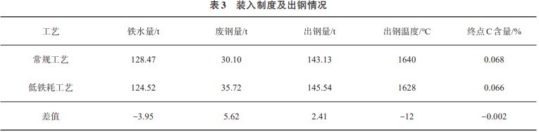 低鐵耗工藝與常規(guī)工藝的裝入制度及出鋼情況如表3所列。與常規(guī)工藝相比,低鐵耗工藝的鐵水裝入量降低了3.95t,廢鋼裝入量增加了5.62t,出鋼量增加了2.41t,出鋼溫度平均降低12℃,而轉(zhuǎn)爐終點(diǎn)碳含量變化并不明顯。