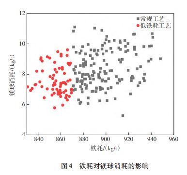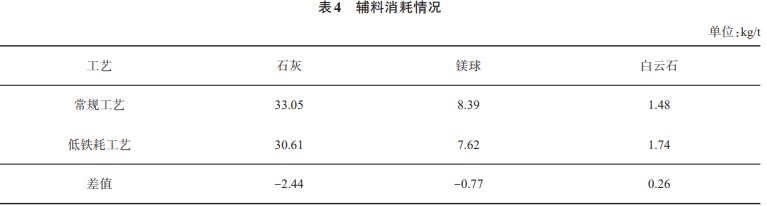 低鐵耗工藝與常規(guī)工藝的各項(xiàng)輔料消耗對比如表4所列。與常規(guī)工藝相比,低鐵耗工藝的石灰消耗降低了2.44kg/t,鎂球消耗降低了0.77kg/t,白云石消耗增加了0.26kg/t。