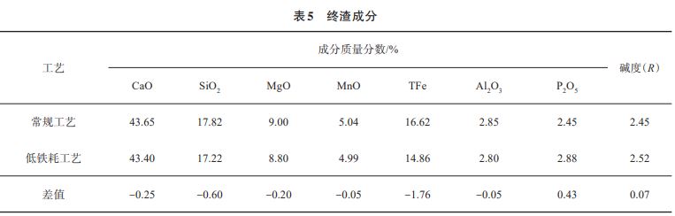 低鐵耗工藝與常規(guī)工藝的終渣成分對比如表5所列。低鐵耗工藝條件下,終渣中的TFe(鐵元素的含量)變化較顯著,降低了1.76%;由于出鋼溫度的降低,有效抑制轉(zhuǎn)爐后期回磷現(xiàn)象發(fā)生,終渣中P2O5含量增加;終渣中的MgO、MnO含量及堿度變化較小。