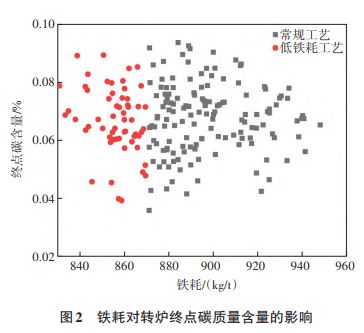 圖2所示為鐵耗對轉(zhuǎn)爐終點(diǎn)碳含量的影響。兩種工藝的終點(diǎn)碳含量都集中在0.05%~0.08%之間,說明鐵耗的變化對轉(zhuǎn)爐終點(diǎn)碳含量影響較小。因此,低鐵耗工藝可以滿足實(shí)際生產(chǎn)過程中鋼種對終點(diǎn)碳含量的要求。