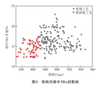 3)與常規(guī)工藝相比,低鐵耗工藝的石灰消耗量降低了2.44kg/t,鎂球消耗降低了0.77 kg/t,轉(zhuǎn)爐終渣TFe含量降低了1.76%。