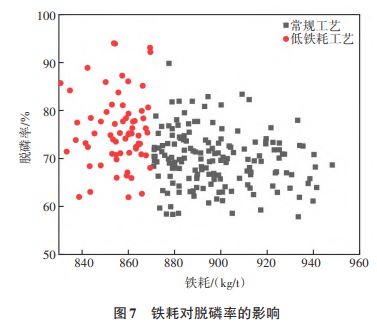3.4 低鐵耗工藝對脫磷率和終點(diǎn)磷的影響