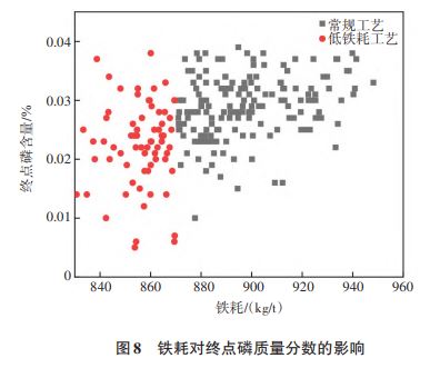 3)低鐵耗工藝的平均脫磷率達(dá)到 77.9%,相對于常規(guī)工藝提高了8.1%;且終點(diǎn)磷含量在0.03%以下的爐次達(dá)到90%以上。