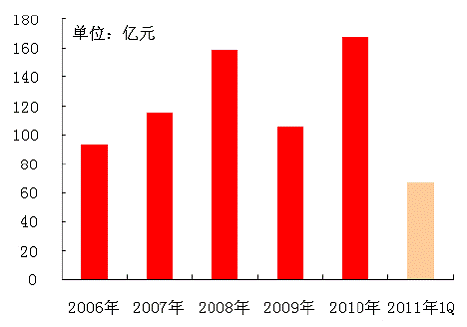 主營(yíng)業(yè)務(wù)收入方面,持續(xù)保持上升勢(shì)頭。2010年實(shí)現(xiàn)營(yíng)業(yè)收入166.18億元,同比增長(zhǎng)53.06%;2011年一季度實(shí)現(xiàn)營(yíng)業(yè)收入67.1億元,同比增長(zhǎng)141.69%。